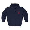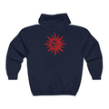 A midweight zip-up hoodie that wears like your favorite go-to layer. The black, classic-fit sweatshirt features a bold red sunburst graphic on the back and a smaller embroidered-style emblem at the left chest for a worn-in, music-scene vibe. Built with roomy front pockets and an adjustable hood, it moves easily from late-night shows to chilly commutes. Thoughtfully made with a 50/50 cotton-poly blend and tubular knit construction, it feels substantial without being bulky and holds up through frequent wear. Subtle details — metal zipper, DTF wrist prints, and the option for chest embroidery — give it an authentic, lived-in character that complements layered streetwear and collector wardrobes.